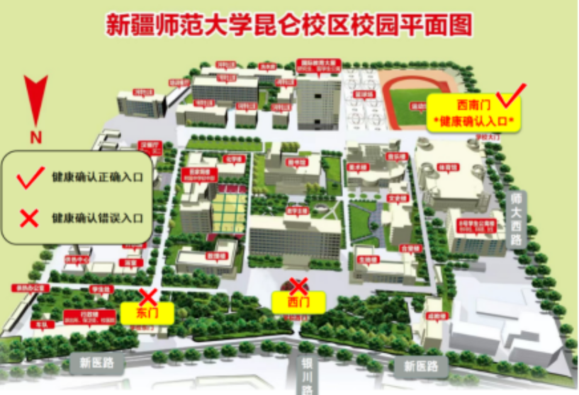 1.关于确认路线。请你沿师大西路南行至师大西南门(沿老年病医院至友好路方向行进),校门口有专用通道通往健康确认处。请你按规定路线进入,完成确认工作后及时离开。