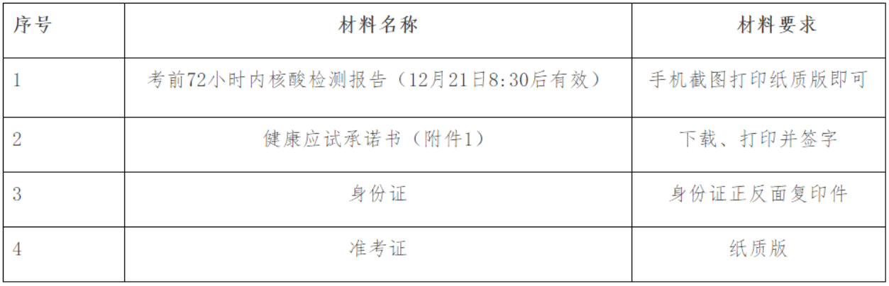 补充说明:第1考场为我校校园内住校考生。住校考生请于12月23日10:30-11:30,携下述材料前往昆仑校区国际教育大厦一楼会议室进行健康确认。