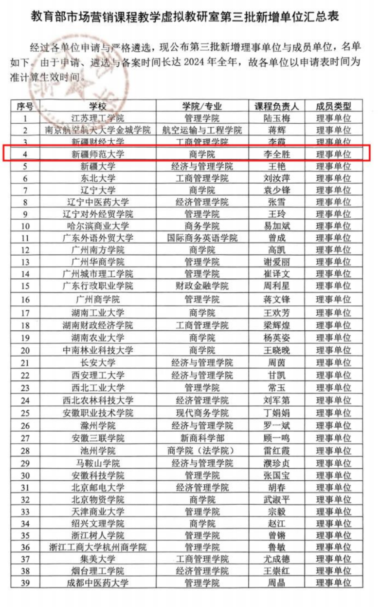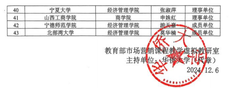 近日,教育部市场营销课程教学虚拟教研室正式公布了第三批理事单位名单,我院经过申报遴选后成功入选,课程负责人为李全胜院长。
