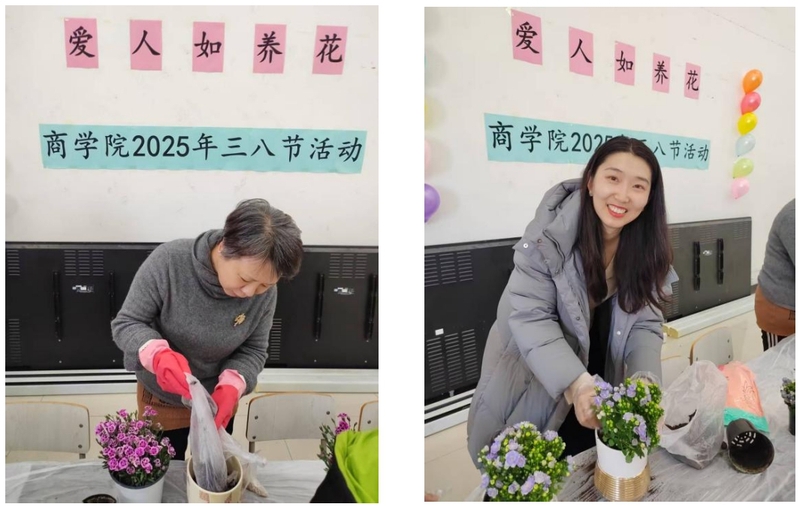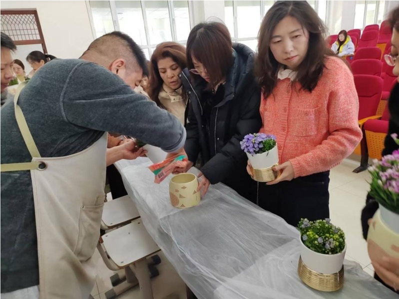活动中,女教职工们在花卉工作人员简单的介绍之后,亲手种植、体验了培育花卉的乐趣,大家相互分享其他业余爱好及解压方式,增进了同事间的友谊。所有人都悉心呵护着自己的花卉,种植一盆独属于自己的花卉,也收获了一份独属于自己的快乐。