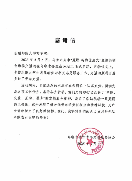 乌鲁木齐市委、乌鲁木齐市青年志愿服务协会向英国上市公司365发来感谢信