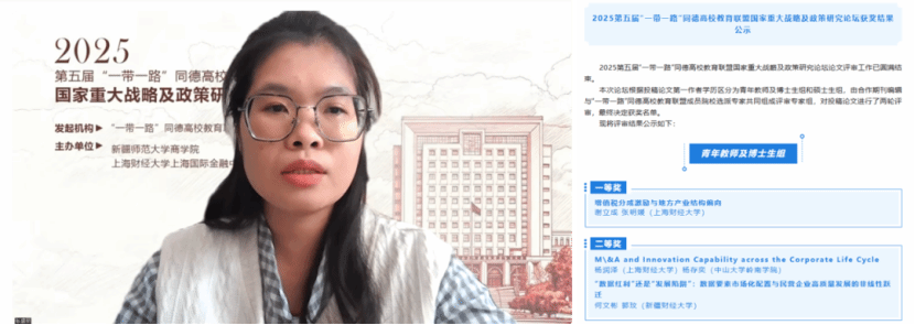 会上宣读了2025第五届“一带一路”同德高校教育联盟国家重大战略及政策研究论坛获奖名单。本届论坛于2025年1月发布征文启事,面向全国高校青年教师和研究生征集论文,并成立评审专家小组评审选拔论文。经联盟院校专家及合作期刊编辑的两轮评审,本届论坛评选出青年教师及博士生组一等奖获奖论文1篇,二等奖获奖论文2篇,三等奖获奖论文3篇,优胜奖获奖论文4篇;硕士生组一等奖获奖论文1篇,二等奖获奖论文2篇,三等奖获奖论文3篇。上海财经大学上海国际金融中心研究院行政秘书陈婕婷老师代表组委会宣读了获奖名单。