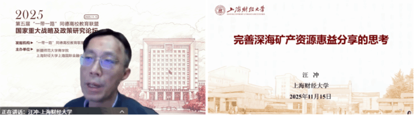 上海财经大学中国公共财政研究院院长汪冲教授围绕“完善深海矿产资源惠益分享的思考”主题发表主旨演讲。汪冲教授指出,深海矿产资源作为人类共同继承财产,其开发利用后的惠益分享是国际财政领域的重要议题,与人类命运共同体、海洋命运共同体理念密切相关。汪冲教授重点分析了当前国际社会提出的三种惠益分配方案,剖析了各方案在公平性、合理性等方面存在的问题与争议,同时分享了中方研究团队提出的优化思路。汪冲教授呼吁跨领域专家学者共同参与相关研究,为中国践行命运共同体理念、参与国际相关制度建设贡献智力支持。