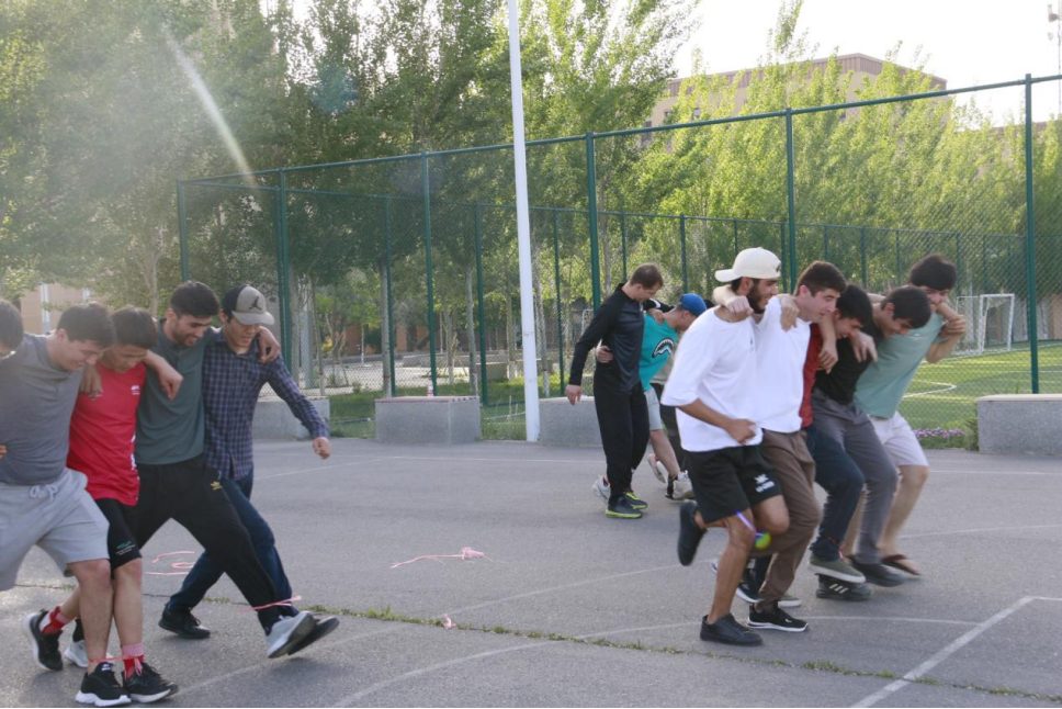 个人项目比赛结束以后是是团队赛项目,同学们分为6个组,在第四项“共赴前程”项目中,选手们携手并肩,步调一致,共同冲向终点。