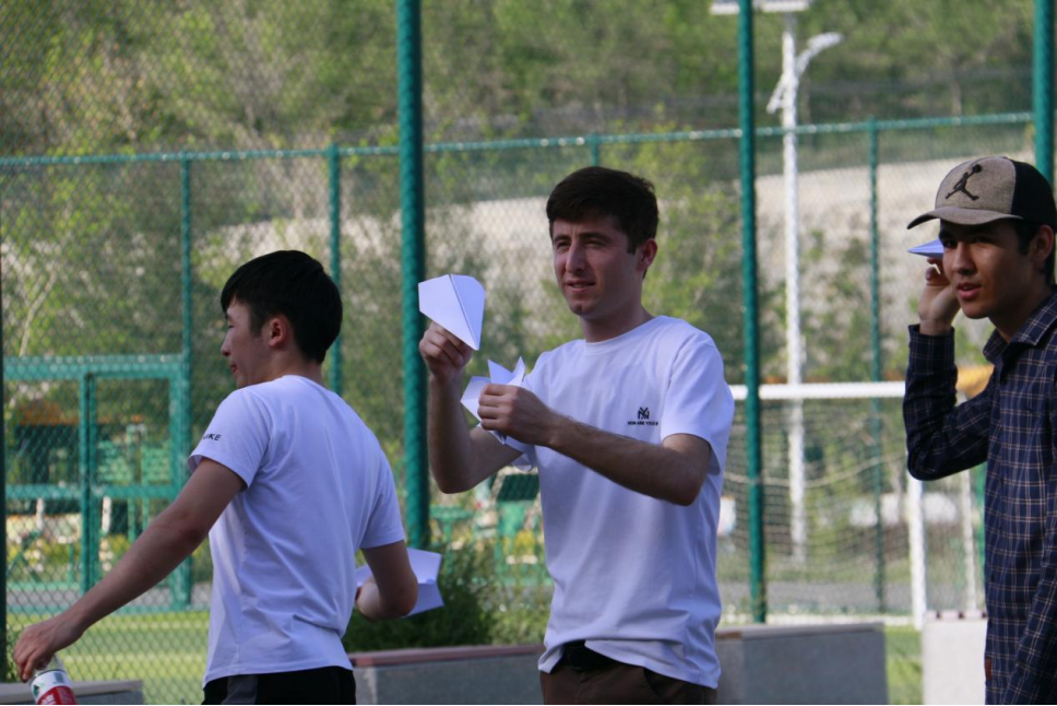 第三项是纸飞机比赛,同学们早早地折起了纸张,待到比赛正式开始,大家站成一排,同时放飞手中的纸飞机,同学们都想让自己的飞机飞的更高、更远。