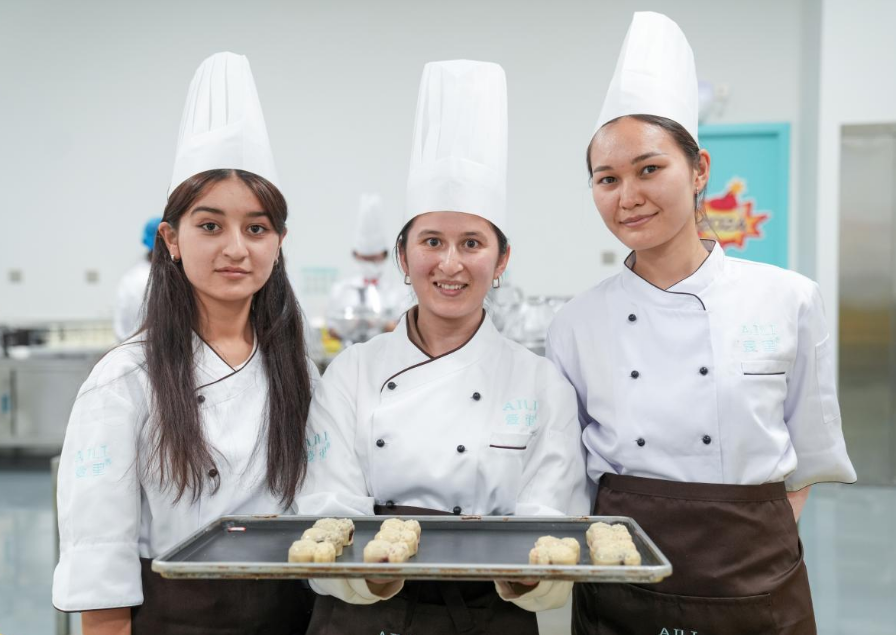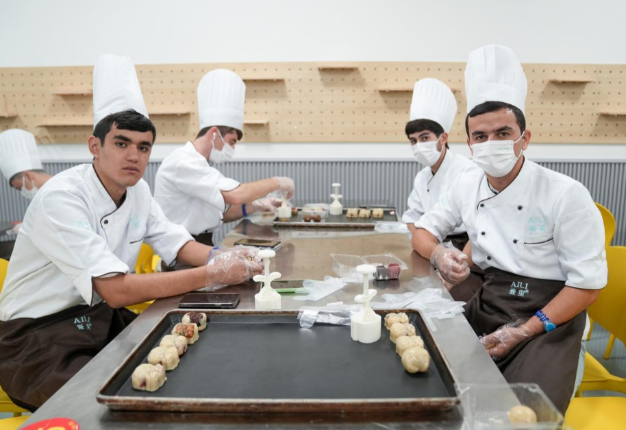 到达新疆爱里蛋糕工厂总部后,留学生们迫不及待地进入月饼制作体验车间,换上专业的烘焙服,戴上厨师帽,大家神气十足,感觉自己已经是一名真正的烘焙师了。洗手消毒后进入车间,经验丰富的师傅简单明了地介绍了月饼制作的技巧,大家就上手开始制作。每个人都认真投入地沉浸在月饼制作的快乐中,压开面皮,放上馅料,慢慢地将馅料一点点包裹进去,最后拿模具压成各种各样漂亮的样子。